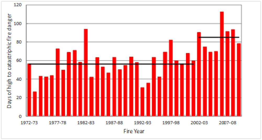 GRAPH: Days above high fire danger, average of 9 Victorian sites, showing statistically significant rapid increase (site data from Bureau of Meteorology)