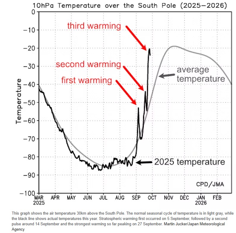 atures over Antarctica have soared 35ºC above average. What does this unusual event mean for Australia? Right now, cold air high above Antarctica is up to 35ºC warmer than normal. Normally, strong winds and the lack of sun would keep the temperature at around –55°C. But it’s risen sharply to around –20°C. The sudden heating began in early September and is still taking place. Three separate pulses of heat have each pushed temperatures up by 25ºC or more. Temperatures spiked and fell back and spiked again. It looks as if an unusual event known as sudden stratospheric warming is taking place – the unexpected warming of the stratosphere, 12 to 40 kilometres above ground. In the middle of an Antarctic winter, this atmospheric layer is normally exceptionally cold, averaging around –80°C. By the end of September it would be roughly –50ºC. This month, atmospheric waves carrying heat from the surface have pushed up into this layer. In the Northern Hemisphere, these events are very common, occurring once every two years. But in the south, sudden large-scale warming was long thought to be extremely rare. My research has shown they are more common than expected, if we group the very strong 2002 event with slightly weaker events such as in 2019 and 2024. Sudden warming may sound ominous. But weather is messy. Many factors play into what happens down where we live. Read more Here