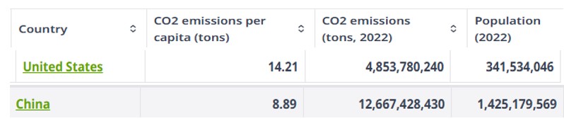 The latest data for world carbon emissions (2022) by country has the USA as the 2nd largest emitter behind China. Note also the carbon footprint of its population is 14.21 tons per person compared to China’s 8.89 tons per person.