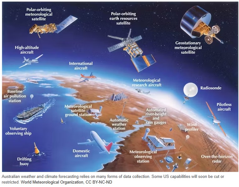 29 July 2025, The Conversation As US climate data-gathering is gutted, Australian forecasting is now at real risk. But even as damage from climate change intensifies, political change overseas is threatening Australia’s ability to track what’s happening now, and predict what will happen next. The United States has historically been a world leader in earth observation systems and freely sharing the gathered data. Sharing of data, expertise and resources between scientists in the US and Australia makes possible the high-quality weather, climate and ocean monitoring and forecasting we rely on. But this is no longer guaranteed. Under the Trump administration, key US scientific institutions and monitoring programs are facing deep cuts. These cuts aren’t just cosmetic – they will end essential data gathering. Australia has long relied on these data sources. When they dry up, it will make it much harder for scientists to look ahead.